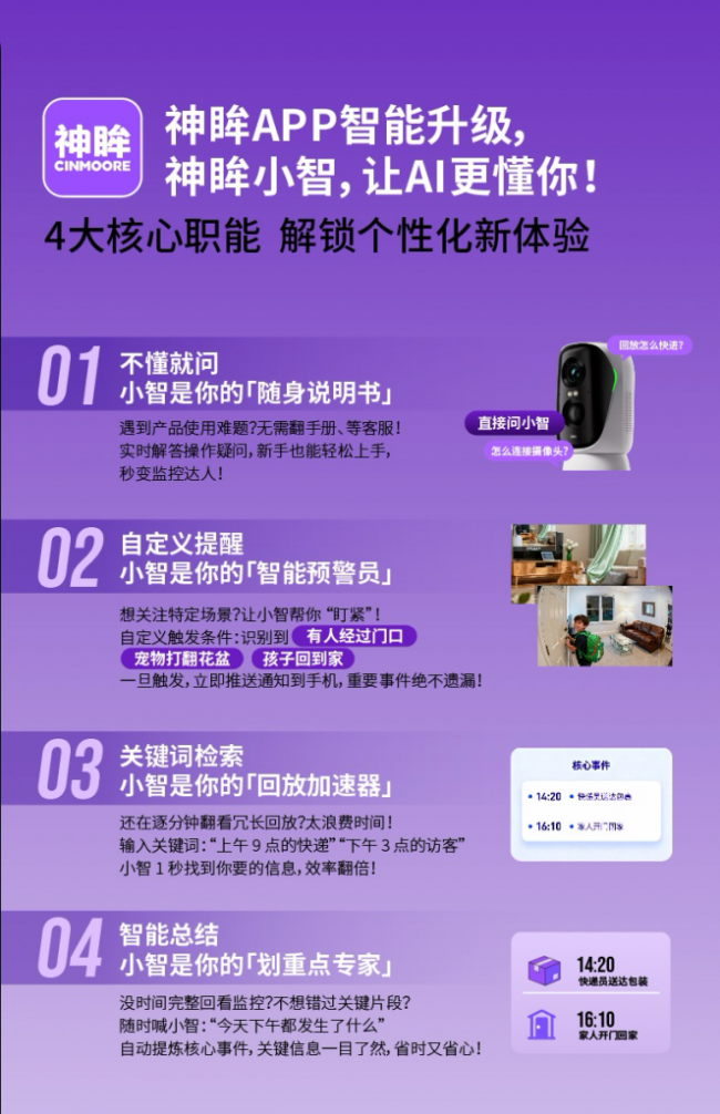 新升级的神眸APP推出神眸小智AI管家,已完成自主指令摘要报告、智能检索监控、高光时刻视频生成、智能配音、文案生成等多种智能功能。“有问题找小智” 成为产品核心交互方式,一上线就获得用户的快速认同,再也不用几个小时查找监控,这种高频升级迭代的智能管家模式,节约用户时间,海量素材和废片,在神眸都是回忆的珍藏,安全的主动权交给用户,使神眸成为首个不断升级智能管家的AI智能影像行业尖货。
