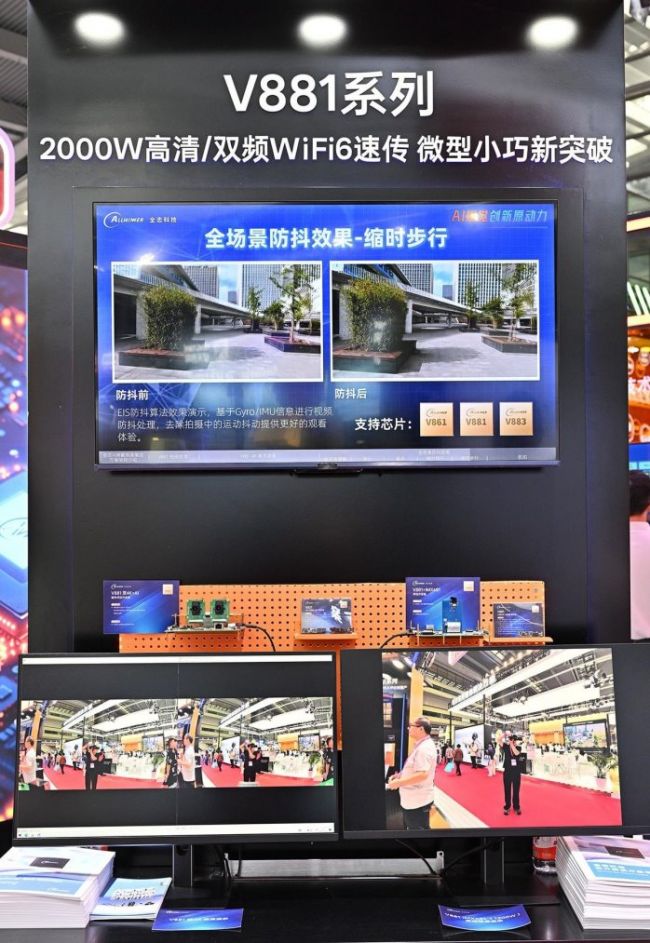 V861系列聚焦运算双维减耗,致力于推动AI-ISP技术向普惠化与低功耗场景发展。现场展示了基于V861的2M AI-ISP 64MB解决方案,呈现其在运力、算力高效利用下,AI影像处理上的显著优势。同时,现场展示了端侧防抖实机演示,呈现了该芯片在复杂场景下出色的稳定成像效果。