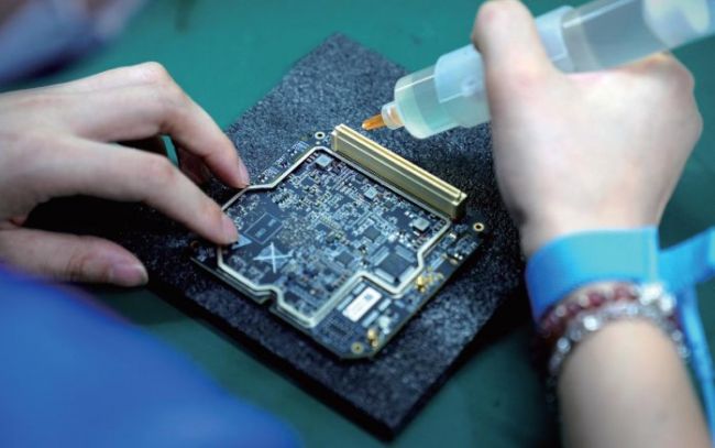 2025年6月26日,工作人员在深圳某车间内为飞控板涂电防胶(李安/摄)