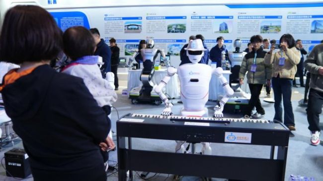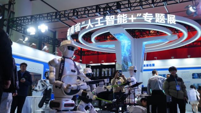 步入湖南“人工智能+”专题展台,一场别开面的“机器人音乐会”正热烈上演。湖南超能机器人技术有限公司打造的“超人乐队”成为全场焦点。钢琴机器人十指灵活跳跃于琴键,吉他手机器人精准拨弦,架子鼓机器人节奏铿锵有力,《我和我的祖国》《孤勇者》等曲目轮番奏响,引得观众纷纷驻足拍摄。
