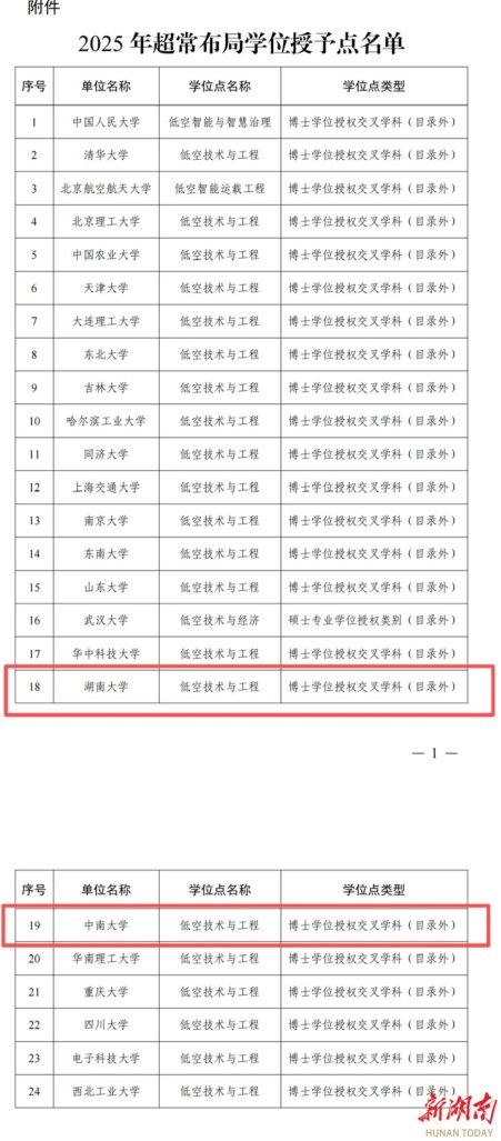 湖南大学同样在战略领域发力。该校此次获批“低空技术与工程”博士学位授权交叉学科,与中南大学共同成为湖南高校布局低空经济人才培养的核心力量。同时,该校新增“集成电路科学与工程”博士学位授权一级学科和“农业”博士专业学位授权类别。