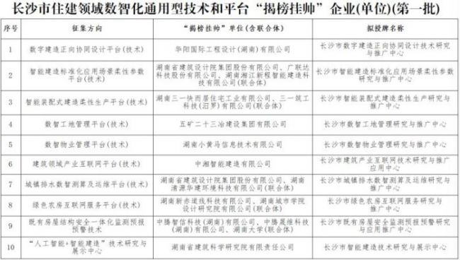 近日,长沙市住房和城乡建设局联合市科学技术局、市数据资源管理局、市工业和信息化局,正式公布长沙市首批住建领域数智化通用型技术和平台“揭榜挂帅”企业(单位)名单,共10家企业(含联合体)成功入选,标志着长沙在系统性推动建筑行业数字化转型、抢占全国数字住建与智能建造制高点的关键一步落地见效。