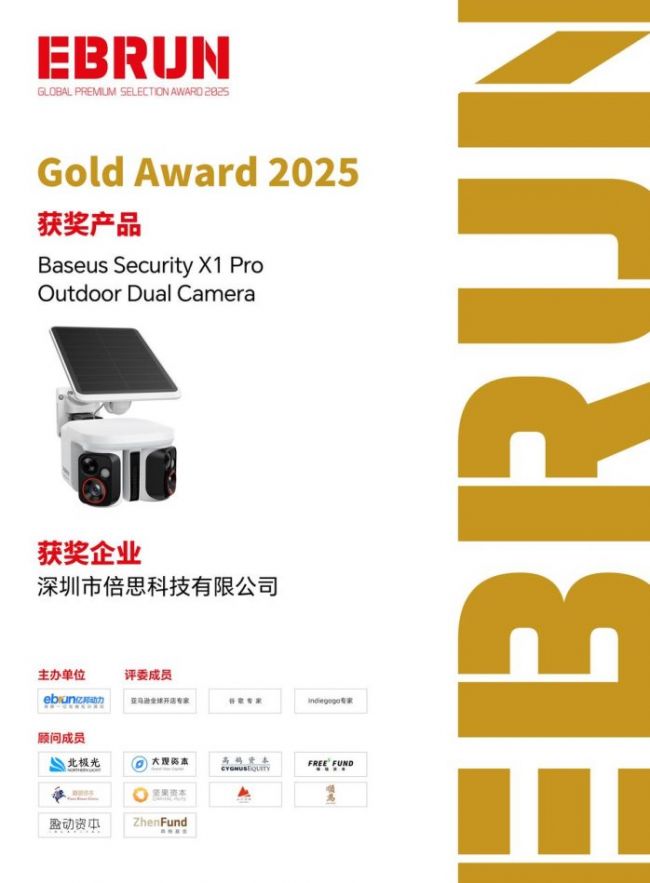 在激烈的角逐中,全球知名消费电子品牌Baseus倍思(深圳市倍思科技有限公司) 凭借卓越的产品创新力与技术突破脱颖而出。其重磅新品 “Baseus Security X1 Pro Outdoor Dual Camera” 经过层层评审,成功斩获2025届最高荣誉奖项——EBRUN全球好物Gold Award 2025。