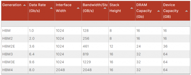高带宽内存(HBM)的出现正是为了破解这一难题(见下表)。通过垂直堆叠存储芯片,并借助超宽高速接口实现互联,相比传统存储架构,HBM在性能与容量上实现了跨越式突破,迅速成为承载先进人工智能工作负载的首选存储方案。