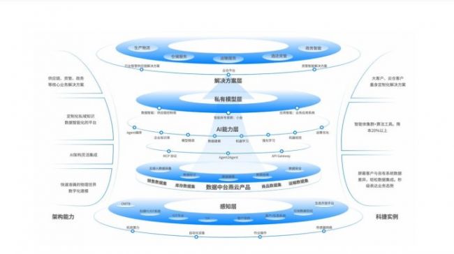 AI 能力层是技术核心所在,基于多种集成开发运营平台,具备模型微调、Agent 编排、机器学习、运筹优化、机器视觉、强化学习等关键技术能力。通过 API Gateway、MCP 协议及 Agent2Agent 架构,实现 AI 与现有业务系统的灵活集成,屏蔽客户与自有系统数据差异,轻松完成数据整合,让 AI 能力能够快速适配各类业务场景。
