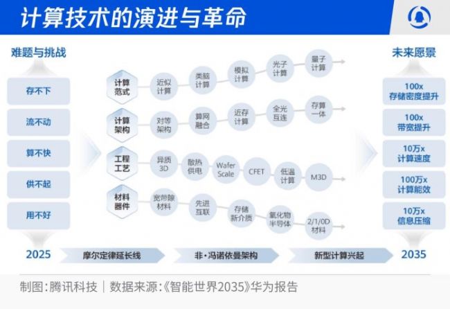 华为在《智能世界2035》报告中预测——2035 年全社会的算力需求将达到惊人的 1027FLOPS,跟 2025 年相比,增长10 万倍。面对如此挑战性的算力增长目标,指引通信产业技术发展的香农定律(1948年克劳德·香农提出)在逐步放缓,牵引芯片指数级发展的摩尔定律(1965年戈登·摩尔提出)的年增速也从50%降低到5%以下,同时产业界发现冯 • 诺依曼经典架构带来的存算分离“能效瓶颈”成为阻碍,我们又站到了人类科技创新的新起点上。我国基础研发必须在材料器件、工程工艺、计算架构、计算范式4类核心领域取得颠覆性技术突破,才能换道赛车,引领“后摩尔时代”的算力革命。