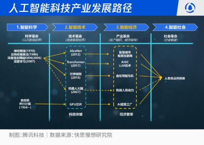 人工智能也不例外,按照“智能科学-智能技术-智能经济-智能社会”健康有序发展,20世纪中叶开始的神经网络、自动机、并行计算等科研成果,在2010年代孕育出AlexNet、Transformer、世界模型、通用GPU芯片,进而推动智慧城市、视频互联网(直播&短视频)、Robotaxi车队、大语言模型个人助手、AIGC创作工具等商业模式与经济形态。