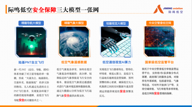 海南际鸣通用航空服务有限公司是国内领先的低空飞行安全基座全场景解决方案运营商,其拥有全球领先技术:锐瞳视觉AI大模型、精瞳导航大模型、晴瞳气象大模型等核心产品,依托中央空管办国家级和省、市级低空飞行综合监管服务平台,领先形成低空飞行安全保障“AI模型+产品+平台”的一体化解决方案,该模型构建了空天地一体化防控的“探、识、判、打、控”安全网。
