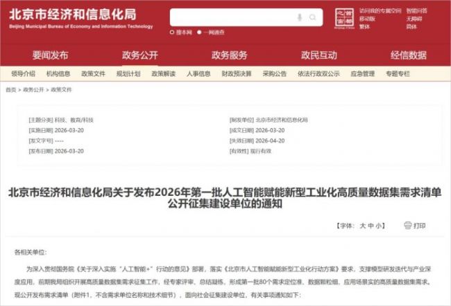 3月20日,北京市经济和信息化局发布通知,公布首批80个人工智能赋能新型工业化高质量数据集需求,并面向社会公开征集建设单位。