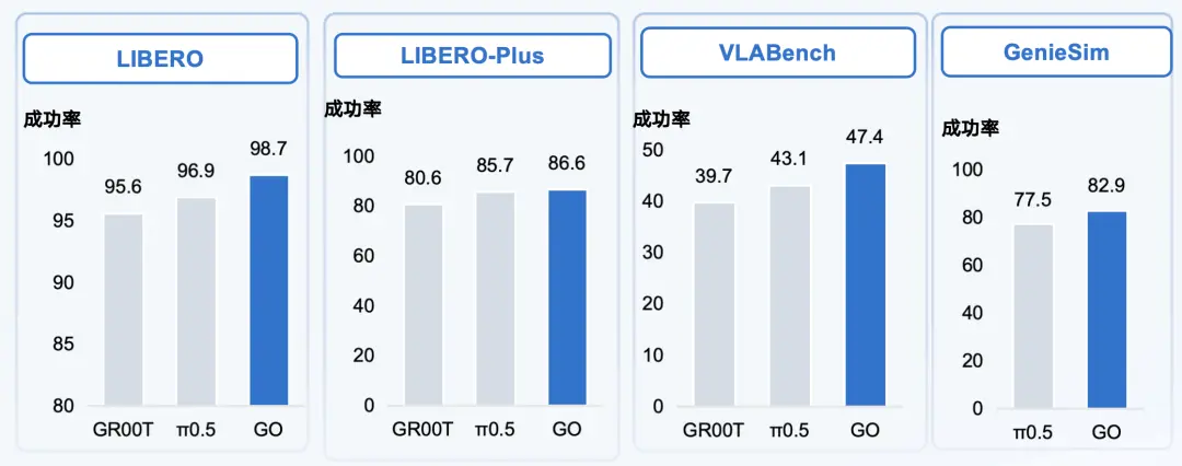 LIBERO-Plus Benchmark:在包含相机、光照、背景和噪声等多种环境扰动的设置下,GO-2 零样本测试取得 86.6% 平均成功率,显著超过现有方法,表现出了超强的泛化能力。