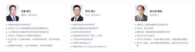 三位联合创始人均来自中科院自动化所,被业内称为“学术天团”。董事长王磊博士,41岁,2016年获天津大学管理科学与工程博士学位,2009年进入中科院自动化所,历任工程师、副研究员及研究员,曾获“吴文俊”人工智能创新奖和北京市科技进步奖,现任人工智能安全与超级对齐北京市重点实验室副主任。