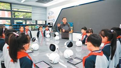 在浙江省金华市金东区实验小学的AI创客教室里,老师通过人工智能教育机器人开展人工智能项目课程教学。