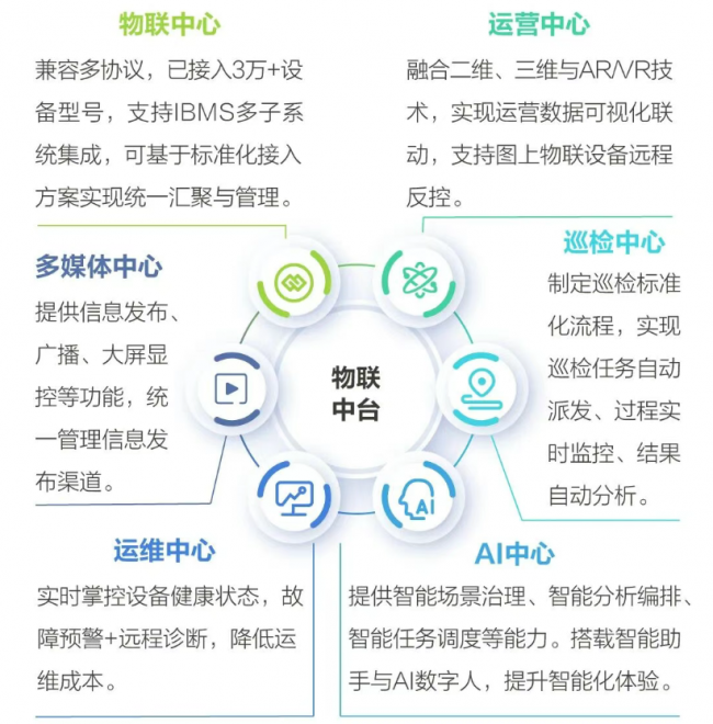 平台以物联中台为数智底座,构建六大功能中心,形成“感知-分析-决策-执行”的全链路闭环。