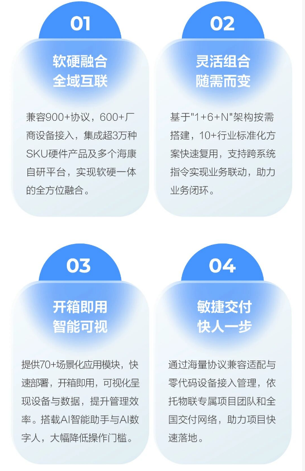 基于物联标准建设、物联接入汇聚、物联资源开放三大能力能快速接入不同品牌、不同协议的设备,打造统一的物联底座,感知全局。