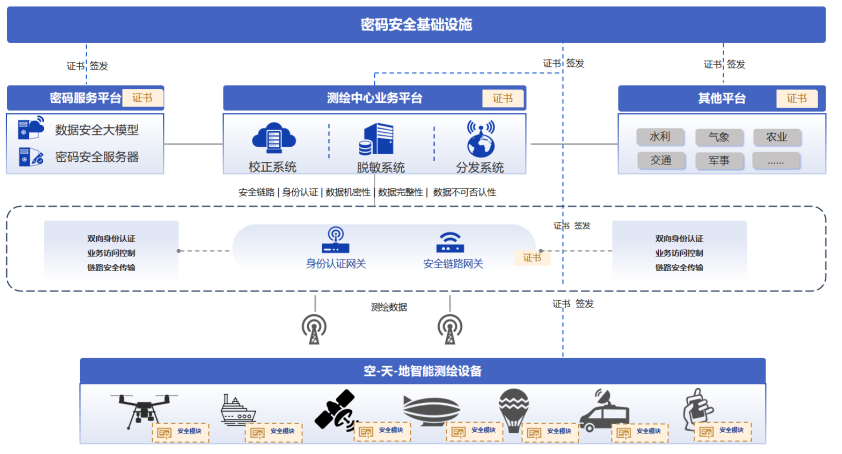 在安全管控上,将密码技术作为核心基石深度融合。方案构建了基于国密算法的统一公钥基础设施(PKI),为卫星、无人机等各类参与设备签发数字证书,实现“一机一证”的可信身份管理。在数据传输环节,采用基于国密算法的传输层安全协议,建立物理层防窃听安全通道。对于敏感测绘数据,则运用国密算法进行加密处理,并创新性地采用国密对称与非对称算法融合策略,实现“一机一密”,确保数据在采集、传输、存储、使用全生命周期的安全可控,有效防范了身份冒用与数据泄露风险。