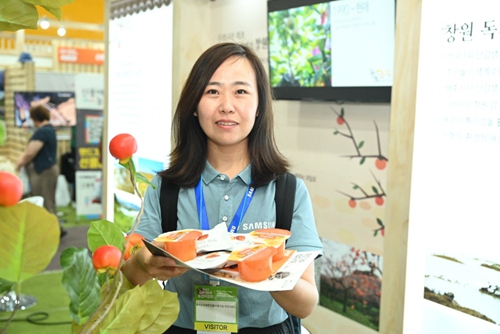 2023“村带头人访韩”活动期间,杨维娜参观农博会柿子深加工产品