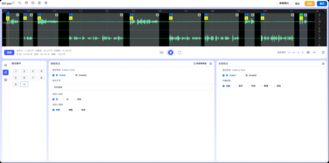 支持中文、英文、中英混合以及小语种标注,支持上百种语音的转录,自有模型支持音字转换为韵律、拼音、音标、词性等文本内容。同时内置标注通用规则校验系统,自动检查标注内容的规范性与准确性,确保标注质量。