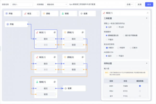 支持多种视频处理需求,包括审核、抽帧、追踪标注、视频打点,覆盖多种流程应用场景。可以同时上传多段视频在一个作业中,执行第一段视频标注时,工具自动加载后续视频,大幅节约视频加载时间。标注作业支持多工序并行执行,多流程配置实现实时数据流转,显著缩短标注周期。