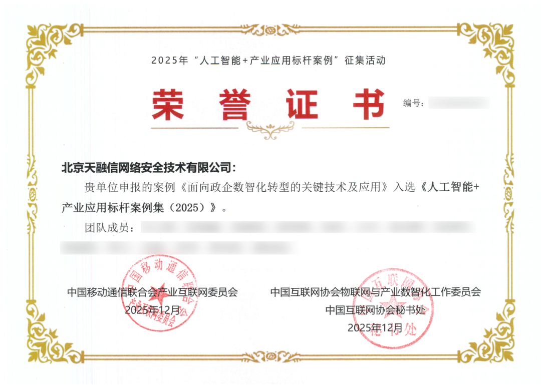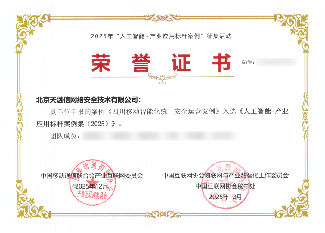 近日,由中国互联网协会、中国移动通信联合会联合组织的“人工智能+产业应用标杆案例”征集活动结果正式揭晓。天融信凭借在人工智能与网络安全融合领域的卓越实践荣获“人工智能+标杆单位”称号,三大核心应用案例成功入编《人工智能+产业应用标杆案例集(2025)》。
