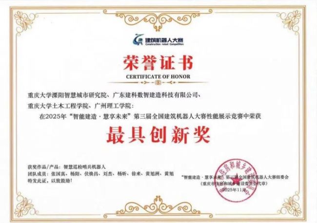 本次获奖是高校科研院所与企业深度协同创新的重要成果。作为项目主要完成单位,重庆大学溧阳智慧城市研究院充分发挥在智能建造、人工智能、机械工程等领域的学科积淀与科研优势,联合广东建科数智建造科技有限公司的产业资源,以及重庆大学土木工程学院、广州理工学院的技术支撑,构建起“理论研究-技术研发-产业转化”的高效协同链条。