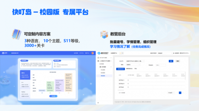 “快叮岛校园版” 聚焦当前学校在 AI 与编程教学落地中的核心痛点——平台碎片化、教学难组织、学习难持续、成果难沉淀,打造学校提供一套真正能长期使用的解决方案。在快叮岛校园版中,学校可以自主完成课程配置、班级与账号管理以及教学安排,将原本分散的教学环节整合到一套清晰、可控的教学体系中。学生通过校园身份登录,即可在贴合学校教学场景的界面下,开展图形化、Python、C++ 等多语言学习,降低使用门槛的同时,保证学习路径的连续性,区别于“一套课程通用所有学校”的传统模式,快叮岛校园版支持多层级管理与灵活定制,实现因校制宜的教学落地。