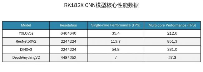 * 不同 CNN 模型在RK182X 上的核心性能数据如下: