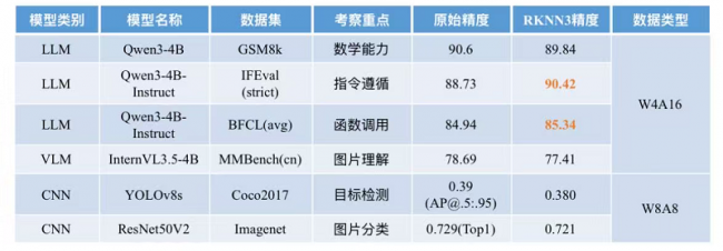 RKNN3 SDK V1.0.0 针对不同类型模型采用差异化量化策略,其中 LLM/VLM 模型采用 W4A16 G32 量化策略,CNN 模型采用 W8A8 量化策略。在大幅提升推理性能的同时,量化后模型精度与原始 float32 版本基本持平,部分模型精度实现反超,有效控制精度损失,真正做到性能升级、效果不减。