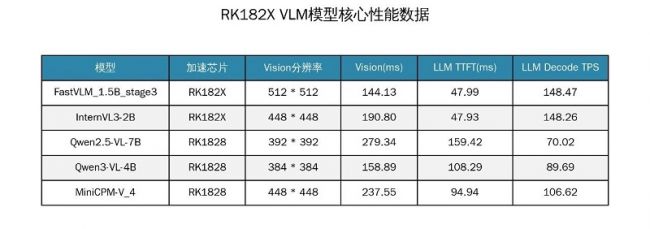 *不同 VLM 模型在 RK182X 上的核心性能数据如下: