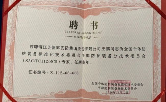 近日,从全国个体防护装备标准化技术委员会传来喜讯:江苏恒辉安防集团股份有限公司的王鹏同志正式受聘为全国个体防护装备标准化技术委员会手部防护装备分技术委员会(SAC/TC112/SC5)专家,任期三年(证书编号:Z-112-05-058)。