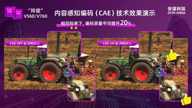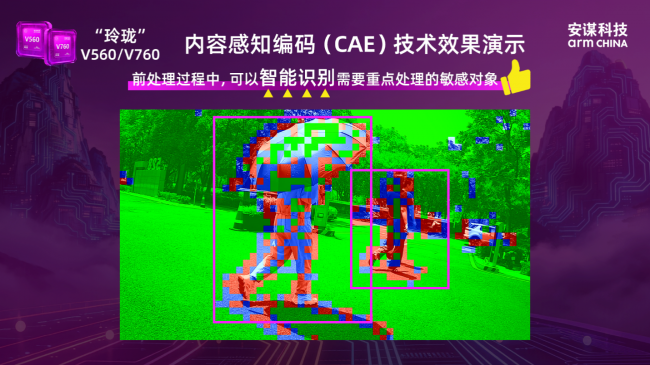 安谋科技Arm China推出面向AI应用的新一代视频处理器IP——“玲珑”V560/V760,创新性地集成了自研的内容感知编码技术(Content Aware Encoder,CAE)。该技术在编码器中集成轻量化AI,为其装上 “感知大脑”,可实现“图像语义分析-像素级预处理-码率动态分配”全链路智能优化,显著降低码率,提升压缩率,改善视频质量,能广泛应用于从云端数据中心到终端设备的各类产品,充分满足超高清视频时代对编码效率、画质体验与场景通用性的需求。