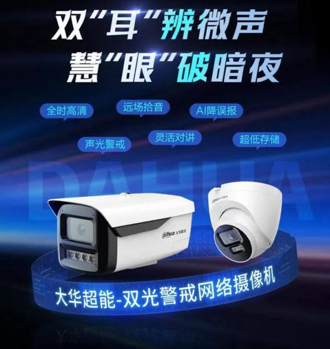 大华股份推出超能-双光警戒网络摄像机,其核心特点是通过整合先进的听觉(“双‘耳’”)和视觉(“慧‘眼’”)技术,实现全天候、智能化的安防警戒。