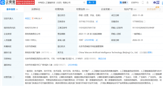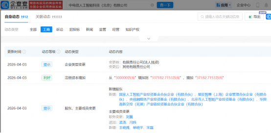 企查查APP显示,近日,中电信人工智能科技(北京)有限公司发生工商变更,新增国家人工智能产业投资基金合伙企业(有限合伙)、央视融媒体产业投资基金(有限合伙)、北京市人工智能产业投资基金(有限合伙)等为股东,同时注册资本由30亿元增至33.72亿元。