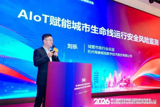 在主论坛环节,海康威视城管市政行业总监刘乐发表《AIoT赋能城市生命线运行安全风险监测》主题演讲。面对城市生命线工程中风险隐患隐蔽性强、传统监测误报率高的痛点,刘乐提出,可通过“智能物联(AIoT)+ 行业大模型”实现三大跨越: