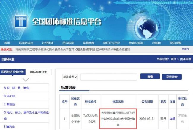 本次发布的T/CSAA 63—2026团体标准,为最大起飞重量超150kg的大型固定翼民用无人机飞控系统的适航设计要点、符合性方法及系统要求等提供了全国统一的技术准则,在系统安全可靠性、功能性能、核心设备、接口与外部交联、环境适应性、运行安全保护等多维度明确硬性要求,直指飞控系统的安全设计关键。该标准的落地既能为企业适航设计提供技术遵循,减少研发反复,也能为无人机整机适航审定提供具体的实施指南,缩短适航认证周期、降低审定成本,推动更多大型固定翼无人机产品走向合规化应用,促进低空飞行安全水平的系统性提升。