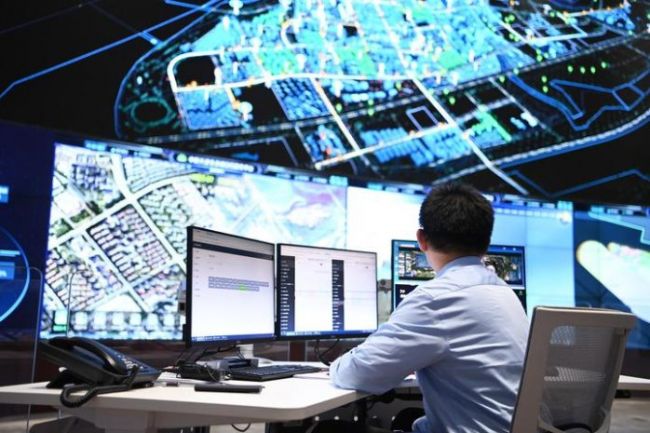 工作人员在中新天津生态城智慧城市运营中心内监控(新华社资料图片)
