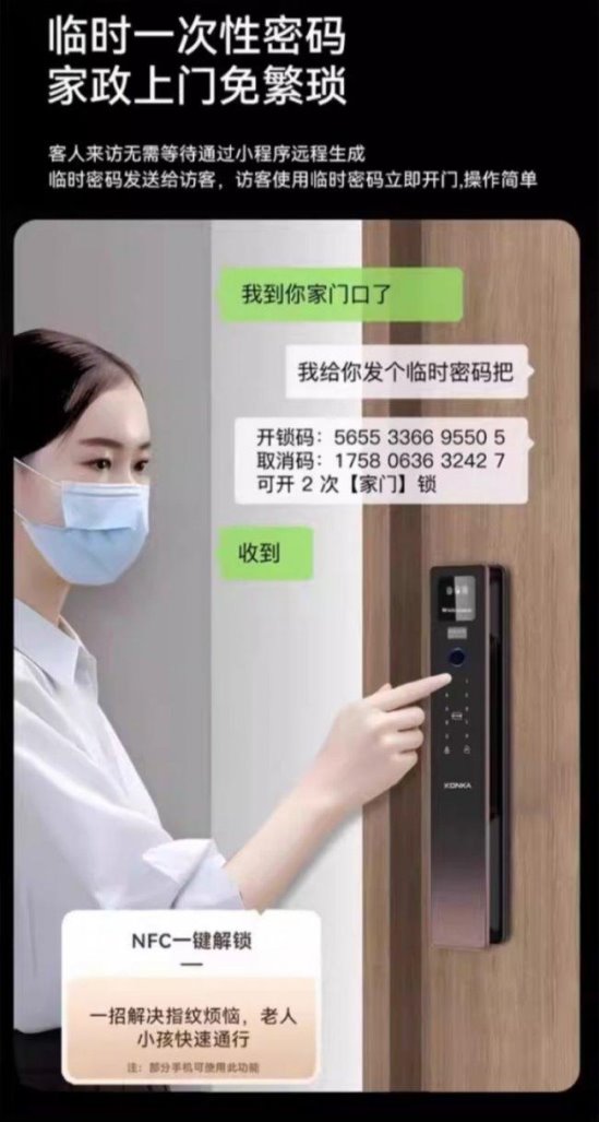 值得一提的是,在家庭访客管理场景中,康佳锁支持临时密码与远程开锁功能的组合应用。家政服务、快递配送、亲友拜访等临时性出入需求,可通过手机端生成限时有效的开锁凭证,无需当面交接钥匙或等待主人归家,大大减少因钥匙复制或密码泄露带来的潜在隐患。