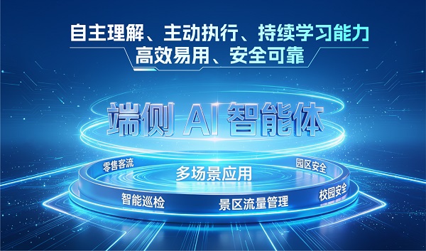 端侧 AI 智能体提供智能易用的可视化操作界面,用户根据实际使用场景,通过文字或语音指令,快速完成零售、工地、园区等多个复杂场景配置应用,极简部署、自主可控。