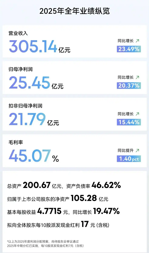 2025 年,安克创新全年实现营业收入 305.14 亿元,同比增长 23.49%;实现归属于上市公司股东的净利润 25.45 亿元,同比增长 20.37%;扣非归母净利润为 21.79 亿元,同比增长 15.44%;毛利率达 45.07%。